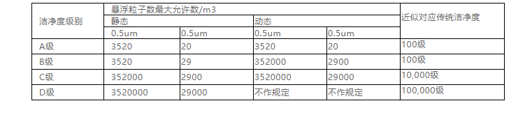 中國GMP(2010年修訂)新版GMP附錄1 無菌藥品.第三章.第九條……潔凈區(qū)各級別空氣懸浮粒子的標準規(guī)定如下